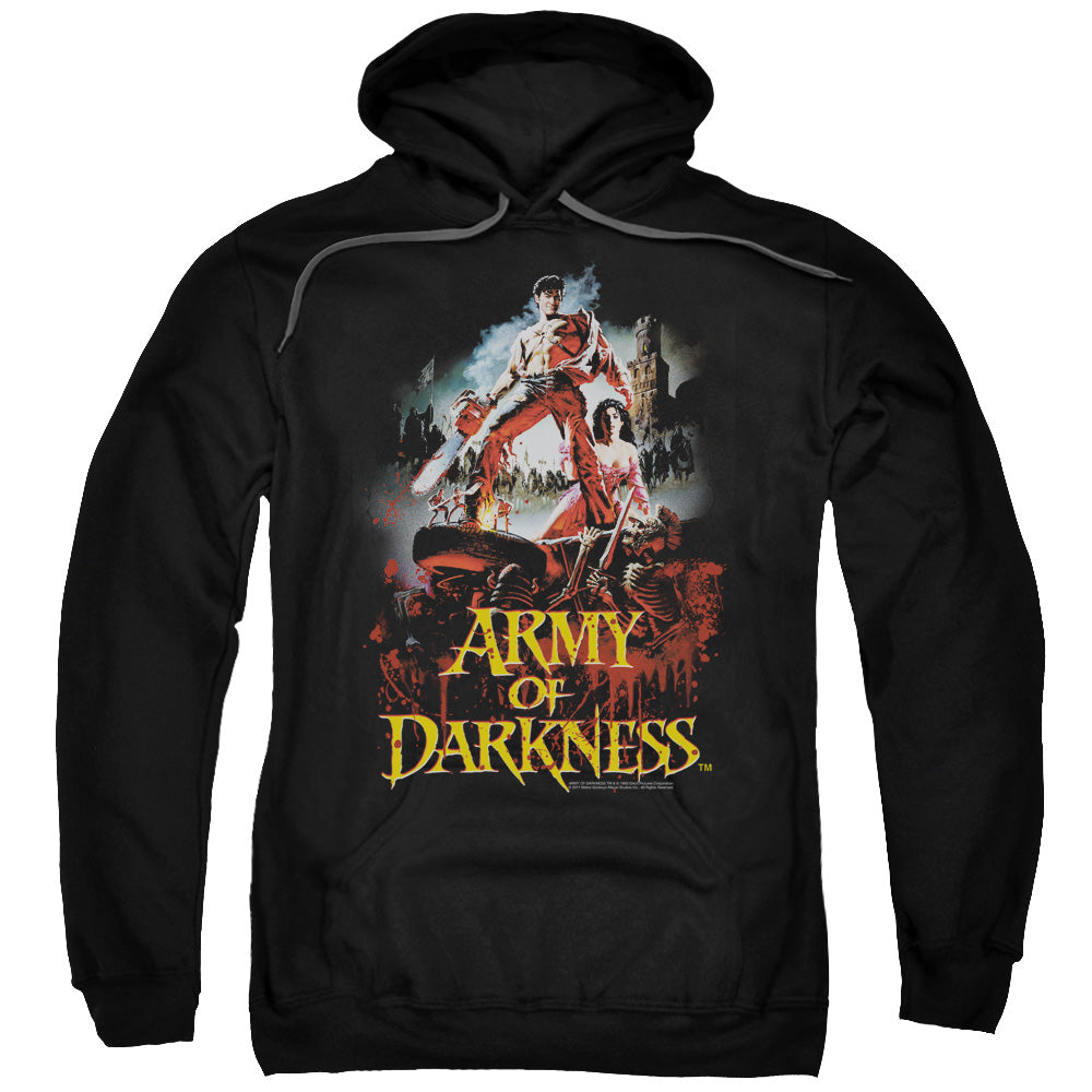 Unleash your love for cult classics with our Army of Darkness Officially Licensed Apparel. Immerse yourself in the world of cinematic magic with each thread that perfectly encapsulates the thrilling spirit of the iconic film. This collection isnƒ??t just clothingƒ??it's a celebration of the enduring legacy of Ash Williams and his action-packed adventures against the undead. Crafted from premium, comfort-enhancing materials, our pieces are designed to stand the test of time in both style and quality. Whether you're gearing up for a movie marathon or adding a dash of classic film finesse to your everyday wardrobe, our apparel makes you the ultimate fan. Elevate your fashion game and merge nostalgic flair with modern coolness. Make a statementƒ??be legendary. Grab yours today and embody the adventure. Because in this world, thereƒ??s never been a better time to proclaim your allegiance to the Army of Darkness.Army Of Darkness Bloody Poster Mens Hoodie Black