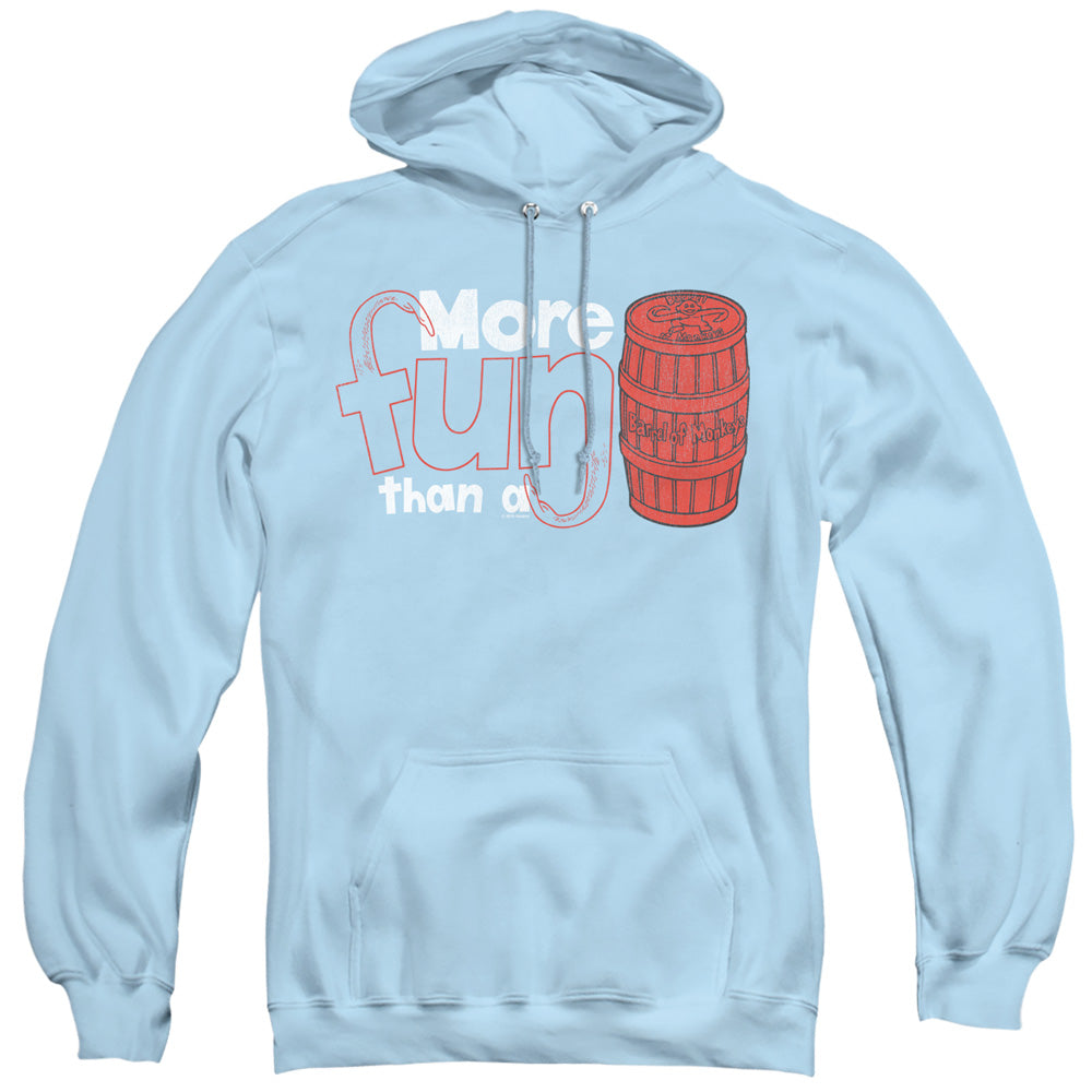 Unleash a cascade of nostalgia with our Barrel Of Monkeys Officially Licensed Apparel, an irresistible fusion of whimsical charm and premium fashion. Inspired by the classic game that has enthralled generations, this exclusive collection is more than just clothingƒ??it's a vibrant celebration of playfulness and style. Crafted from exceptionally soft, high-quality materials, each piece invites you to experience unparalleled comfort while showcasing your unique personality. The intricately detailed designs pay homage to the iconic monkeys, capturing their playful spirit with precision and flair. Perfect for those who dare to stand out, our apparel transforms mere outfits into statements of joy and imagination. Make every day an adventure. Wear the spirit. Own the legacy. Choose Barrel Of Monkeys Officially Licensed Apparel and let the games begin!Barrel Of Monkeys More Fun Mens Hoodie Light Blue