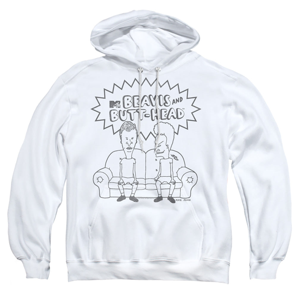 Unleash your inner rebel with the ultimate homage to '90s pop cultureƒ??Beavis and Butthead Officially Licensed Apparel. Drenched in nostalgia and brimming with irreverent style, each piece in this exclusive collection is crafted for the true fan. Made with superior-quality materials for enduring comfort and vibrant printing that captures every iconic smirk and scoff, this apparel is not just clothing; itƒ??s an attitude. Whether you're lounging around or stepping out, let your outfit speak volumes with quirky designs and bold colors that refuse to be ignored. Redefine your wardrobe and join the league of legends with each wear. Itƒ??s not just fashion, itƒ??s a movementƒ??be a part of it.Beavis And Butthead Couch Logo Mens Hoodie White