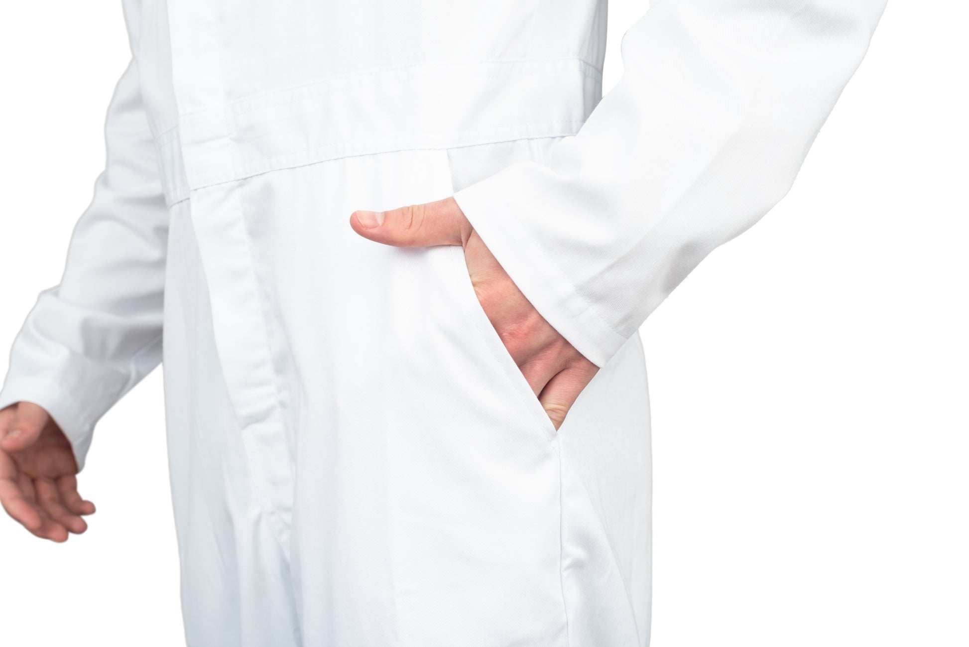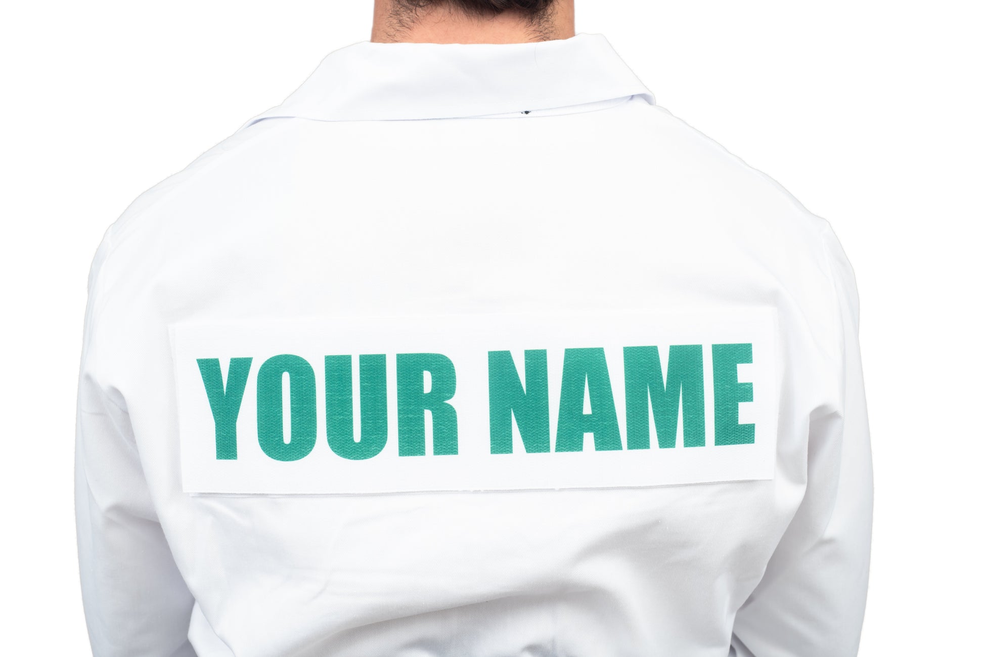 - Costume includes a white long sleeve jumpsuit with 4 pockets, a removable sublimated patch on the back for custom name or text, and a green adjustable hat.