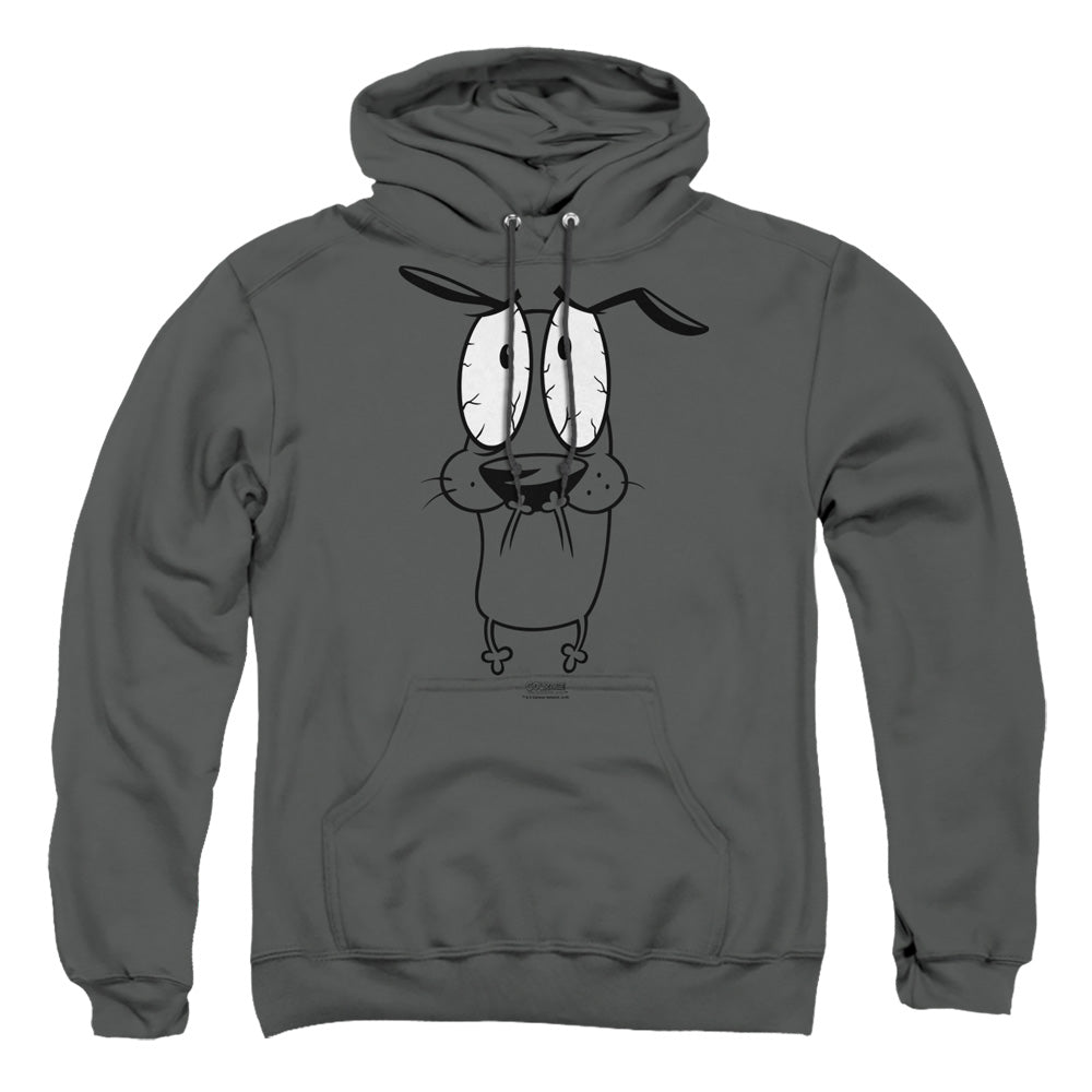 Embrace the whimsy and nostalgia with our officially licensed Courage The Cowardly Dog apparel. This exclusive collection celebrates the quirky charm and adventurous spirit of everyone's favorite pink pooch. Each piece in this distinguished line is crafted with premium, soft-touch fabrics, ensuring unparalleled comfort that stands the test of time. The vibrant, meticulously designed prints capture the essence of Courage's thrilling escapades and bring a splash of bold color to your wardrobe. Whether you're a lifelong fan or discovering the eccentric allure of Courage for the first time, our apparel offers you the chance to wear your love on your sleeve. Don't just follow the trend; set it with style and personality that echoes the enduring legacy of this animated classic. Join the ranks of fellow aficionados and let your attire tell a story of courage, whimsy, and nostalgia. Upgrade your collection today and make every day a courageous adventure.Courage The Cowardly Dog Scared Mens Hoodie Charcoal