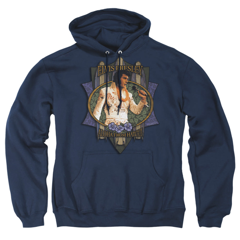 Embrace your inner King with our Elvis Presley Officially Licensed Apparel. Dive into a world of iconic style and unmatched charisma, crafted meticulously for true fans of the Rock 'n' Roll legend. Our exclusive collection features timeless designs and luxury fabrics that capture the spirit of Elvis in every stitch. From classic tees adorned with electrifying rhinestones to plush hoodies that echo his signature swagger, each piece promises a touch of vintage flair and modern comfort. Perfect for those who appreciate timeless elegance and a dash of rebellious flair, our apparel isn't just clothingƒ??it's a tribute. Wear the legend, feel the legacy, and let every day be an encore performance. Perfect for festivals, casual outings, or simply lounging with a hint of rockstar poise, our collection is a must-have for any Elvis aficionado. Step into the spotlight and let our officially licensed apparel be the crown jewel of your wardrobe.Elvis Presley Aloha From Hawaii Mens Hoodie Navy