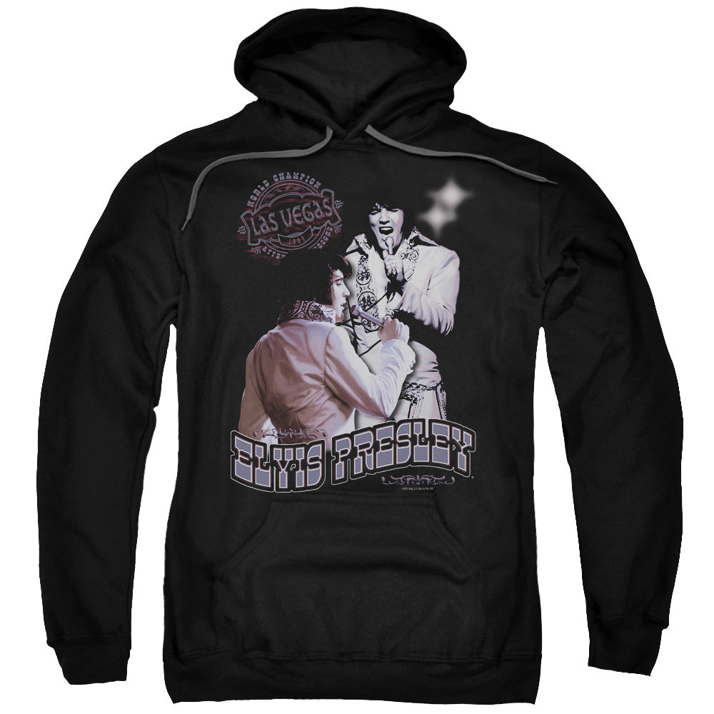 Embrace your inner King with our Elvis Presley Officially Licensed Apparel. Dive into a world of iconic style and unmatched charisma, crafted meticulously for true fans of the Rock 'n' Roll legend. Our exclusive collection features timeless designs and luxury fabrics that capture the spirit of Elvis in every stitch. From classic tees adorned with electrifying rhinestones to plush hoodies that echo his signature swagger, each piece promises a touch of vintage flair and modern comfort. Perfect for those who appreciate timeless elegance and a dash of rebellious flair, our apparel isn't just clothing—it's a tribute. Wear the legend, feel the legacy, and let every day be an encore performance. Perfect for festivals, casual outings, or simply lounging with a hint of rockstar poise, our collection is a must-have for any Elvis aficionado. Step into the spotlight and let our officially licensed apparel be the crown jewel of your wardrobe.Elvis Presley Violet Vegas Mens Hoodie Black