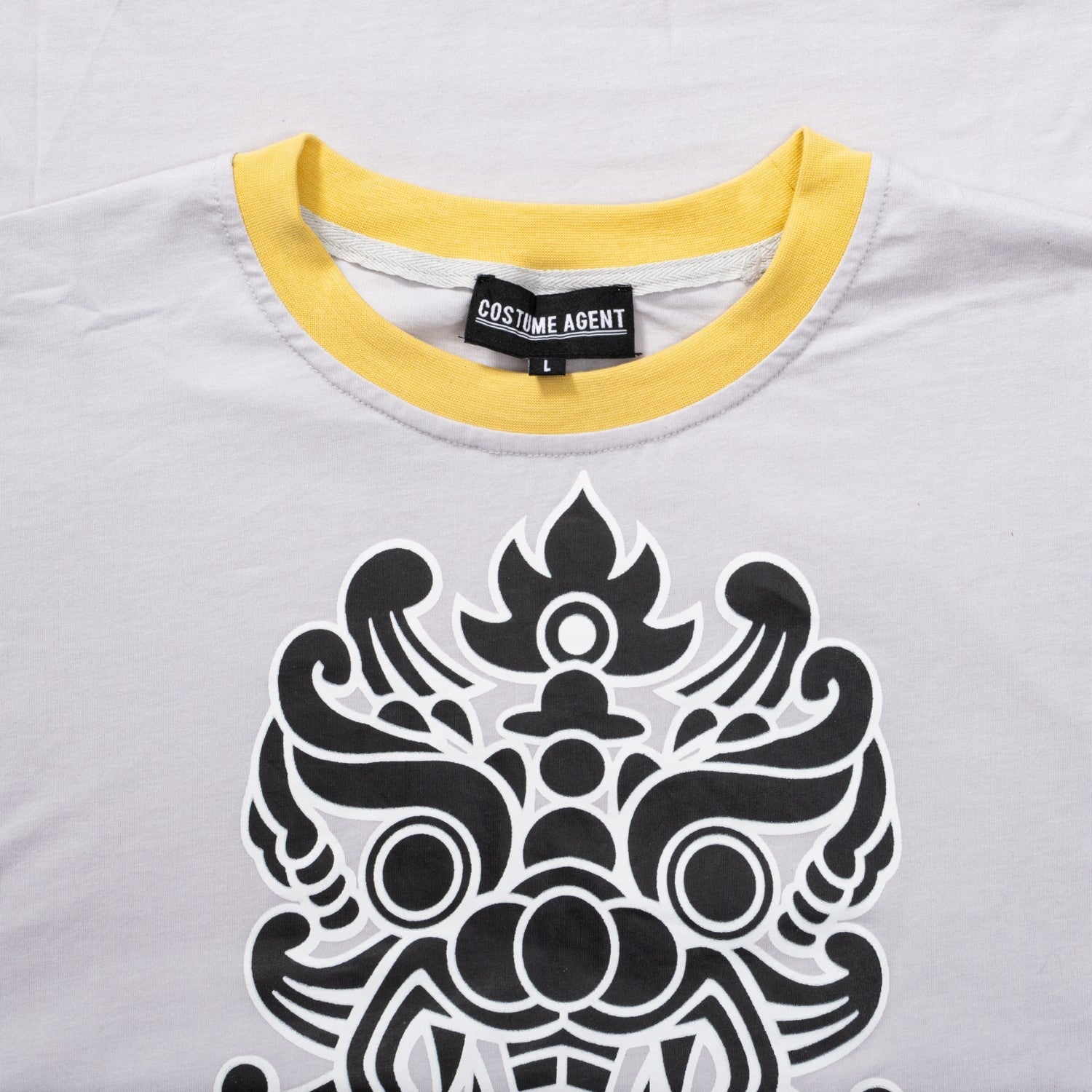 - Features bold black-and-white damask print on a soft gray base, paired with striking yellow ring details on the sleeves and collar for a true-to-screen retro look.