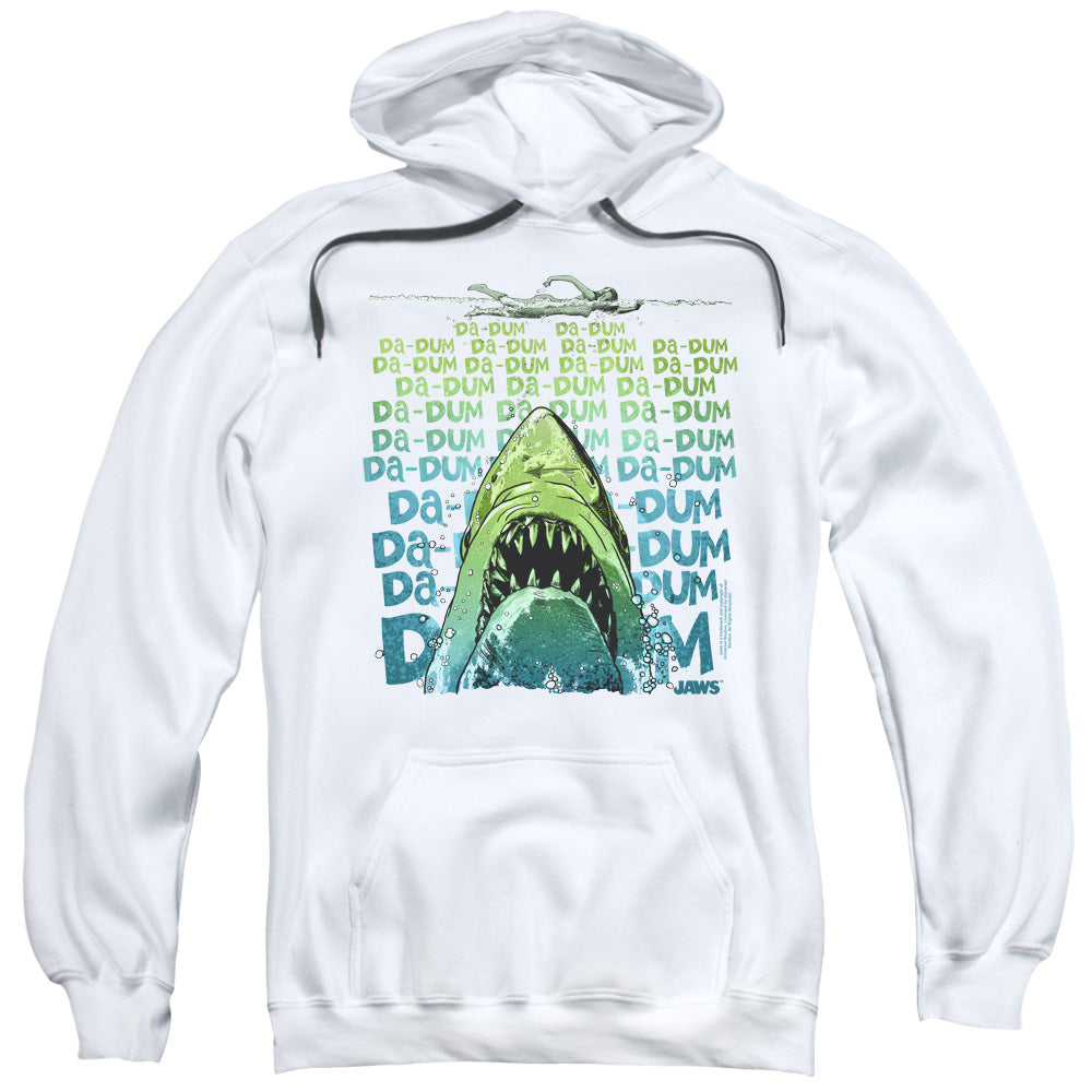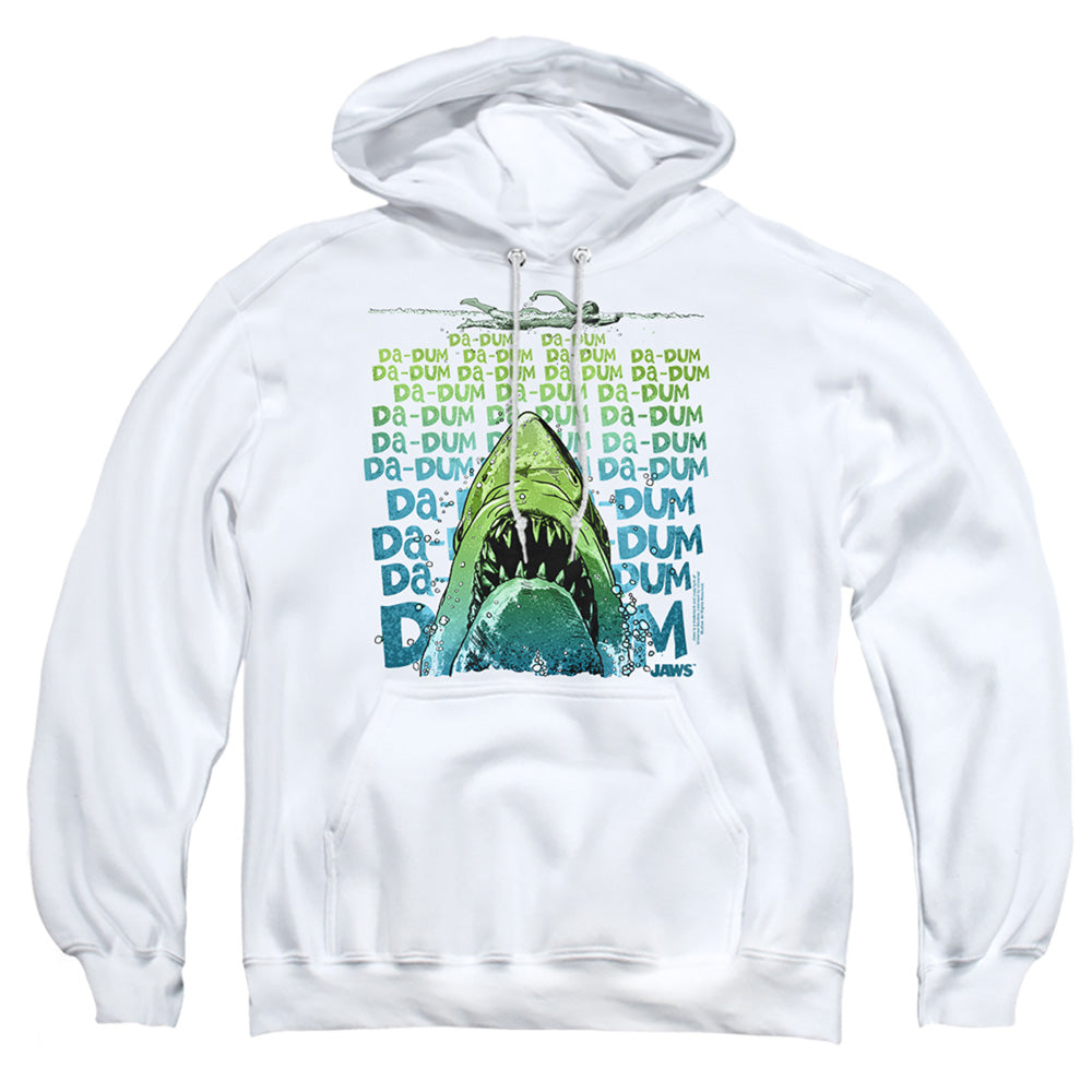 Immerse yourself in cinematic history with our Jaws Officially Licensed Apparel. Expertly crafted for fans of the iconic thriller, this exclusive collection transcends mere clothing, enveloping you in the legendary excitement of Amity Island's most infamous summer. Each piece, adorned with iconic imagery and authentic designs, ensures you proudly wear a badge of pop culture excellence. The premium fabric promises unparalleled comfort and durability, making it the ideal choice for movie marathons or casual outings. Dare to stand out and showcase your classic film enthusiasm with apparel that speaks volumes—dive into timeless style with Jaws and let the great white come alive in your wardrobe.Jaws Da Dum Mens Hoodie White