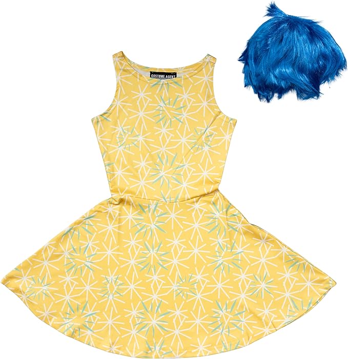 - Complete Costume Set: This joyful cartoon character cosplay set includes a vibrant yellow dress adorned with beautiful flower designs and a short blue wig, perfectly mimicking the look of your favorite animated character.