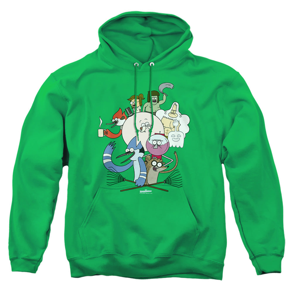 Step into the wonderfully unpredictable universe of 'Regular Show' with our officially licensed apparel, meticulously crafted for the ardent fan in you. Each piece isn't just clothing; it's a vibrant celebration of your favorite animated world, woven meticulously to offer both style and comfort. Bask in the nostalgic allure of iconic characters like Mordecai and Rigby while expressing your unique fandom flair. Our high-quality fabric ensures a snug, enveloping fit, engineered for both casual outings and leisurely days at home. Make every outfit an ode to your love for 'Regular Show' and stand out in a league of your own with apparel that transcends ordinary. Elevate your wardrobeƒ??choose authenticity, comfort, and a touch of cartoon magic today. Don't just wear the show; live it.Regular Show Regular Cast Mens Hoodie Kelly Green