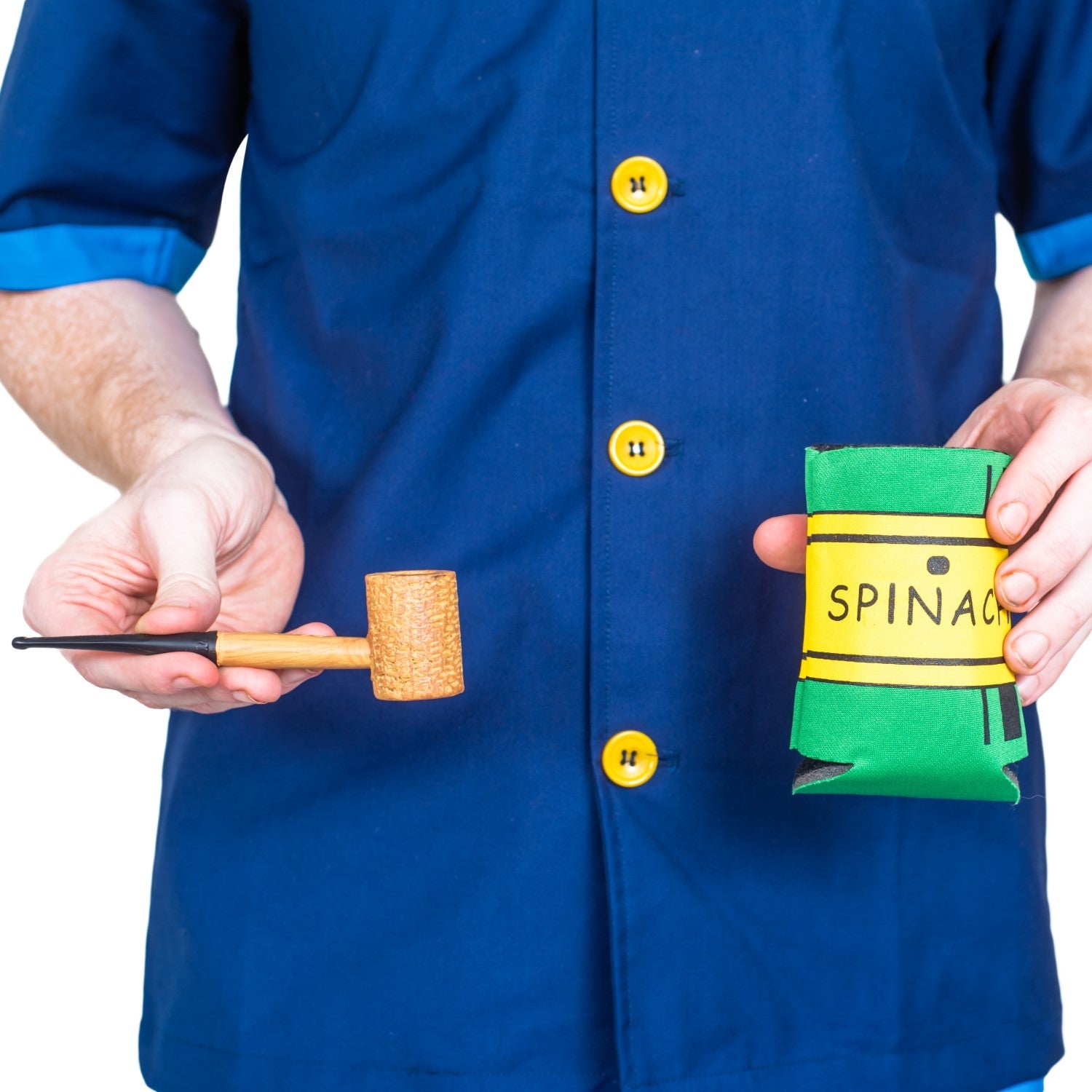 - Includes a Sailor Man Adult Button Down Shirt and Pants set, a Sailor Man Hat, a cup holder, pipe, and muscle arms. Does not include anything else.