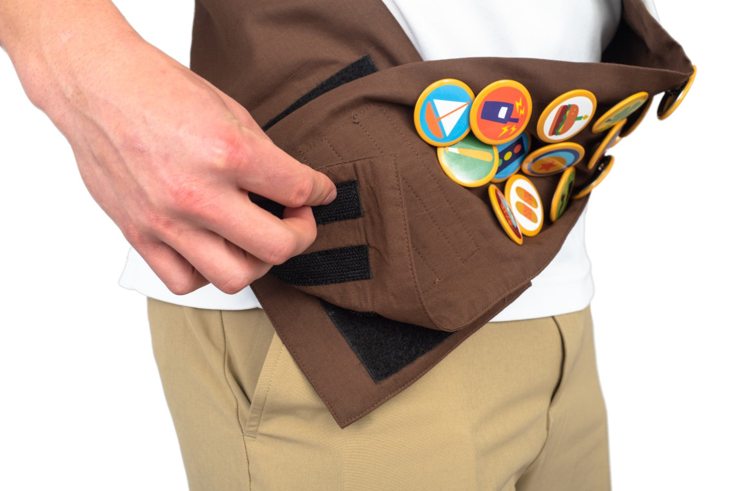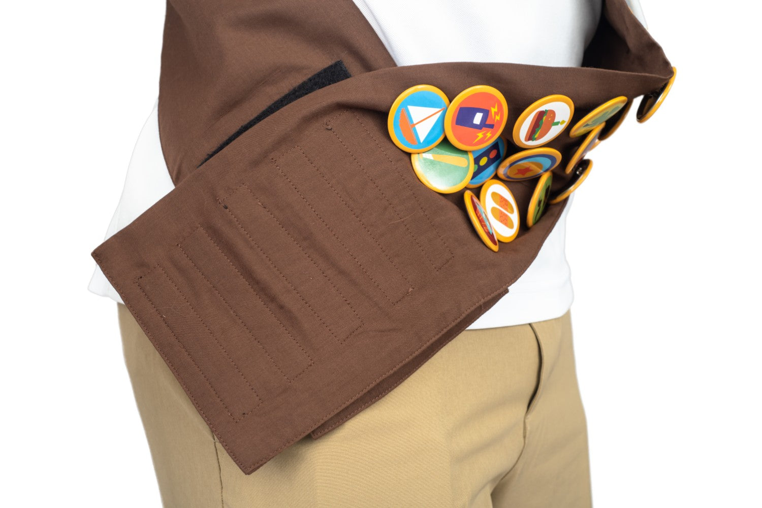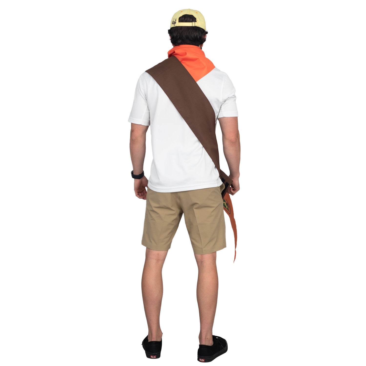 - Costume includes: a yellow adjustable hat, a brown sash with 45 pins, an orange neckerchief, and a Wilderness Explorer Flag