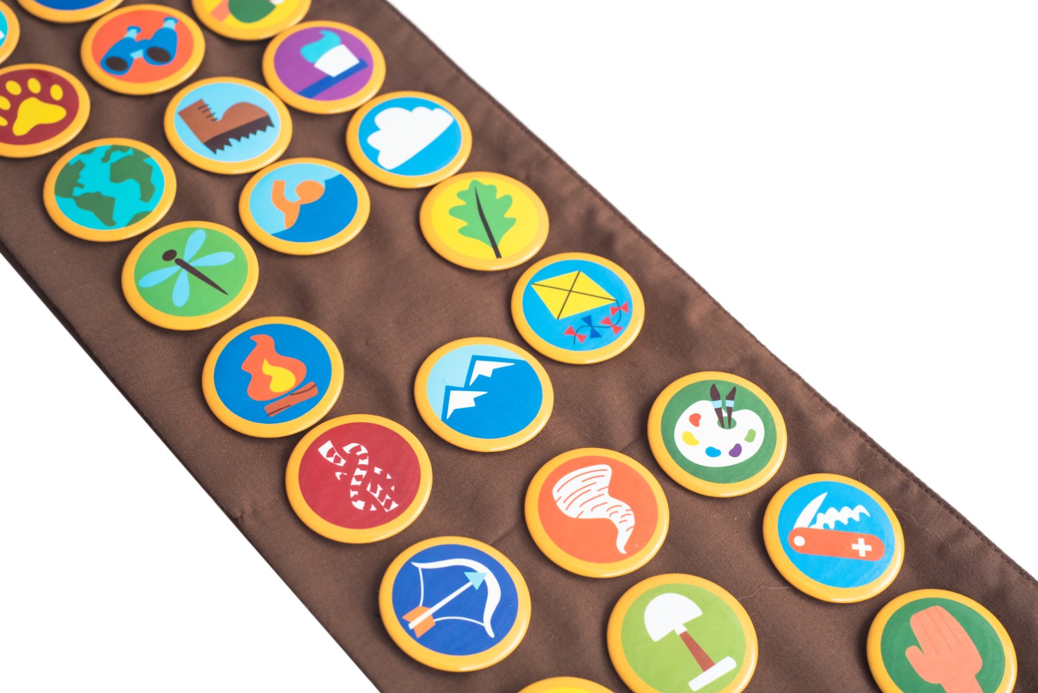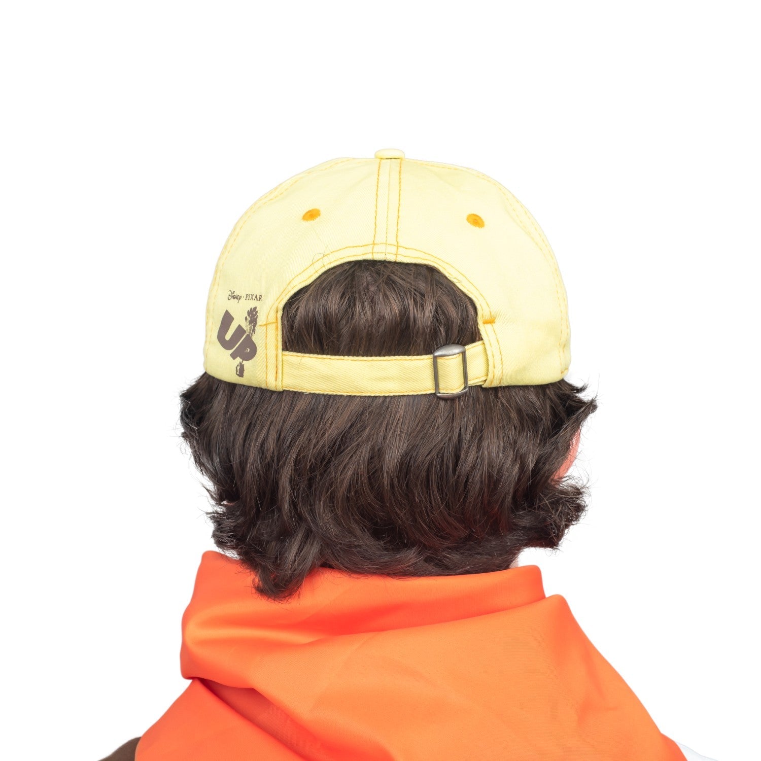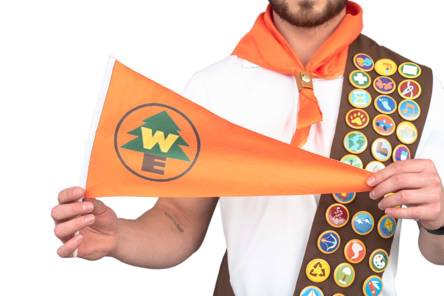 - Costume includes: a yellow adjustable hat, a brown sash with 45 pins, an orange neckerchief, and a Wilderness Explorer Flag