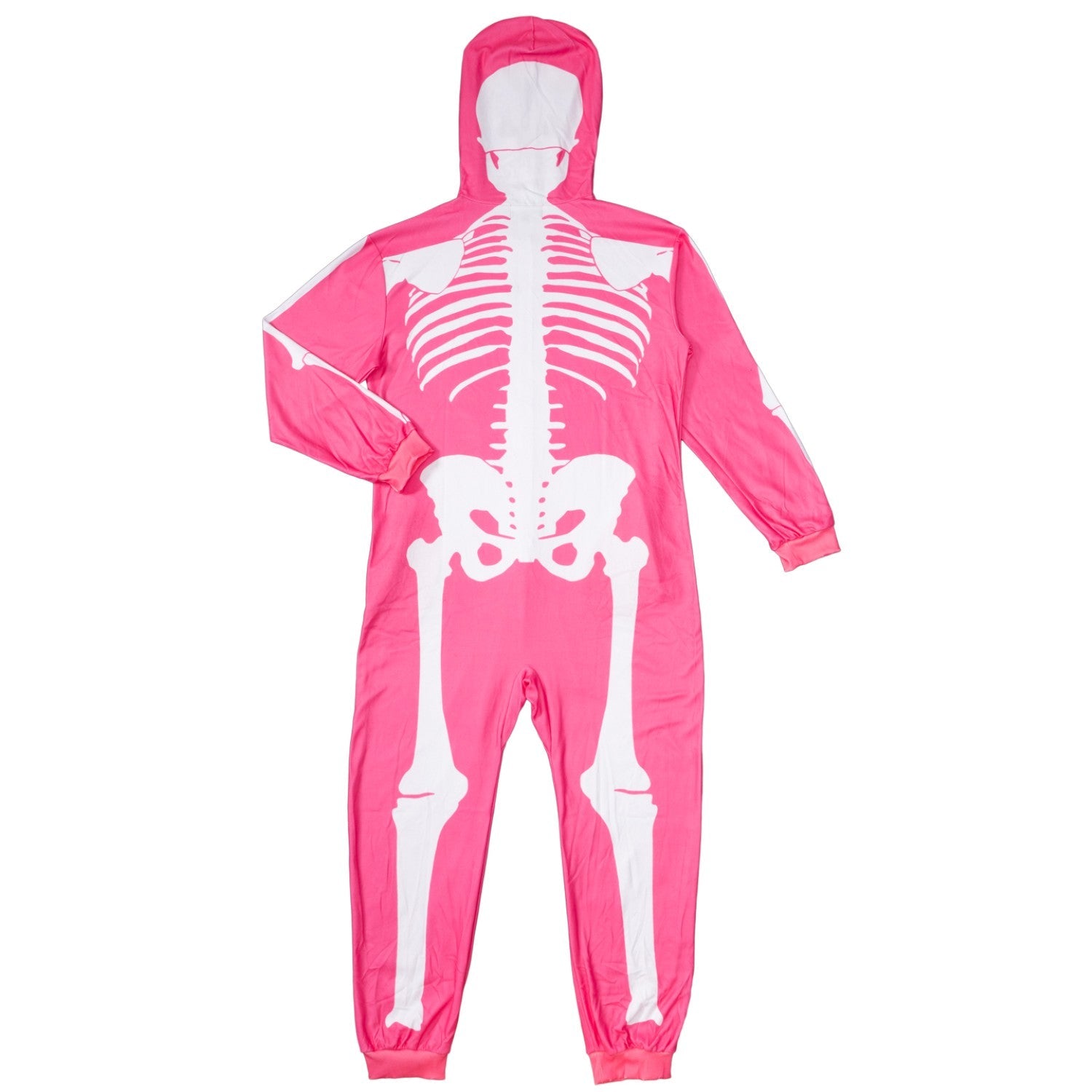 - Stand out this Halloween in a bold pink skeleton costume featuring a full-body jumpsuit design with realistic front and back bone print for a fun and spooky twist.